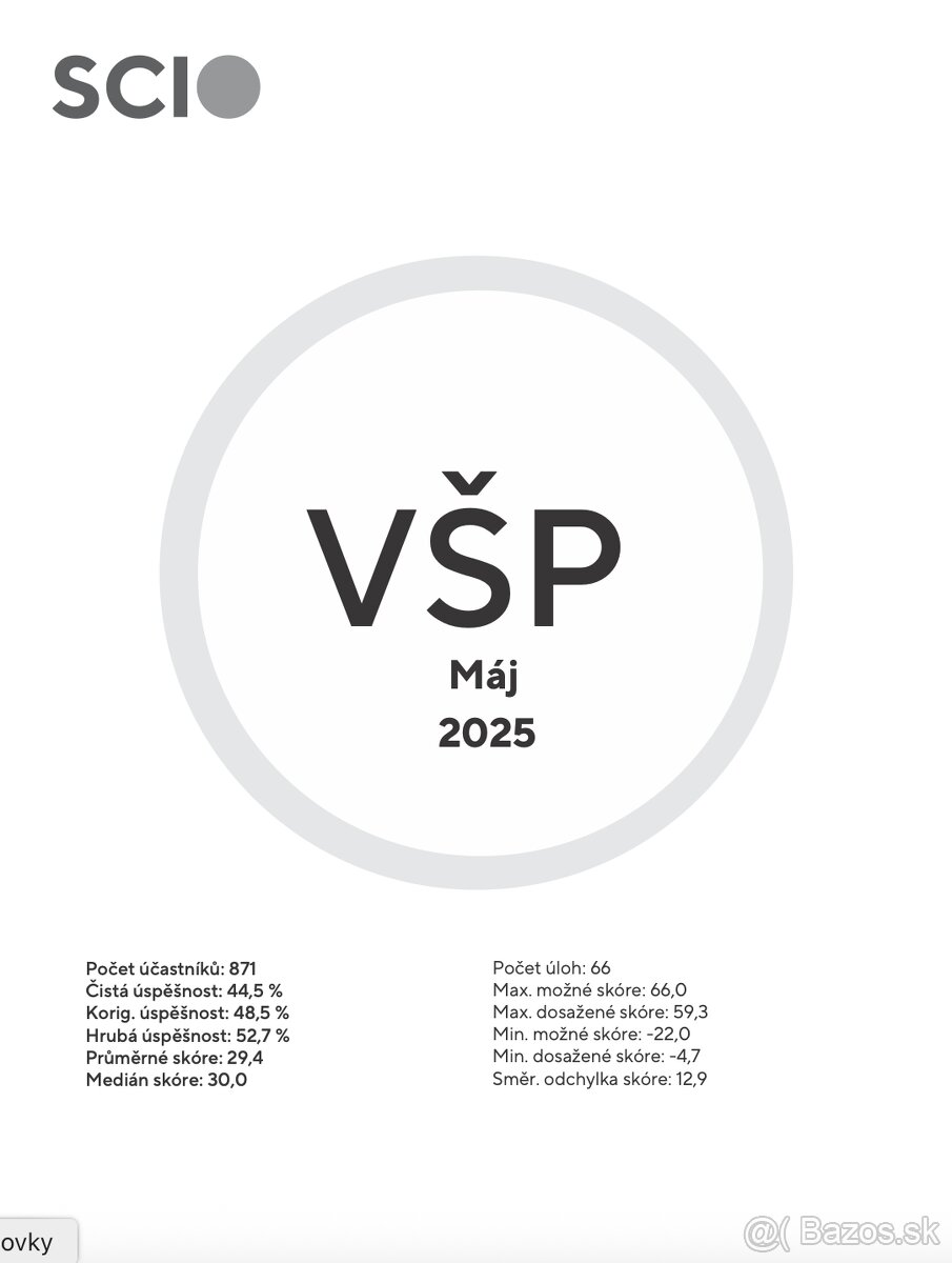 SCIO - [16.12. 2025]Predám študijné materiály na prípravu k SCIO testom (Národné porovnávacie skúšky), ktoré sú využívané pri prijímacích konaniach na viaceré slovenské aj české univerzity.