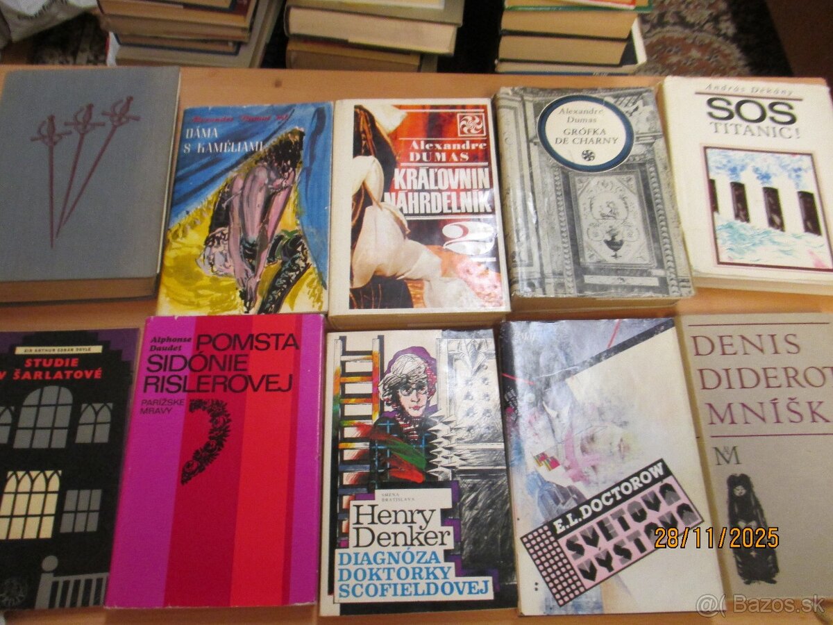 Predám Dumas-Traja mušketieri,Dáma s kaméliami,Královnin náhrdelník 1+2,Grófka du Charny 1+2,Salvator 1+2,Dáma z Monsoreau,,Joseph Balsamo 1+2,Defoe-moll Flandersová,Daudet-Pomsta Sidónie Rislerovej,Doctorow-Svetová výstava,Vitajte v ťažkých časoch,Diderot-Mníška,Dekány-SOS Titanic,Dônčová-Pani z kamenného domu,Panna Izabela,Doyle-Studie v šarlátové,Dickens-Nadejné vyhlídky,Veľké nádeje