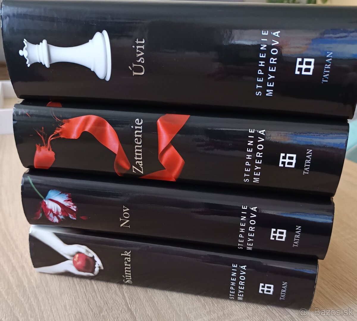 Súmrak, Nov, Zatmenie, Úsvit. Predávam iba spolu. Cena za všetky 4 knihy s poštovným po prevode na účet 60€. Na dobierku neposielam. Kontakt mailom. Číslo vymyslené.