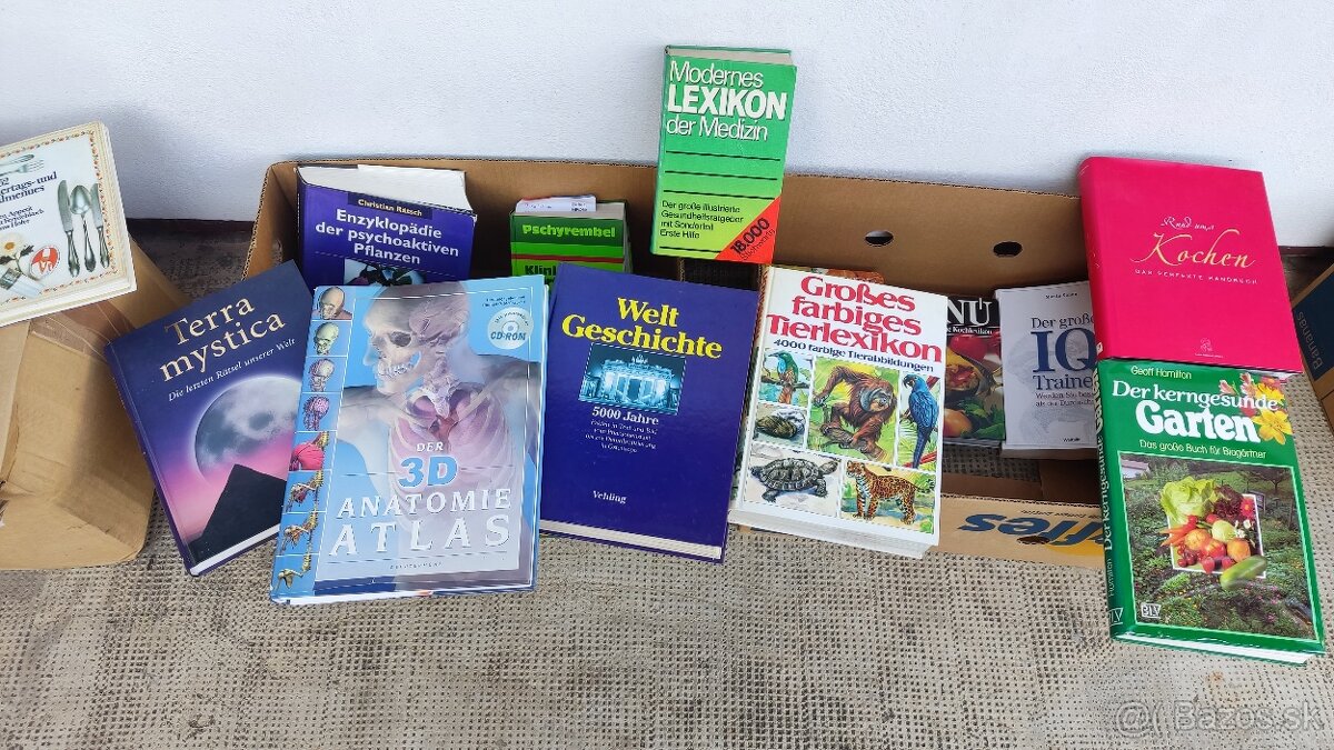 Pri kupe rodinného domu v zahraničí sme našli asi 50-100ks knih. Rôznych žánrov. Encyklopédie,lekárske, psychológicke,náučné, cestopisne , historické ( Egypt, Čína..) ,romány, hlavolamy. Ozaj niektoré sú veľmi zaujímavé. Všetky sú v nemeckom jazyku. My to nevyuzijeme a možno sa niekomu ešte pridajú a urobia radosť.Predám za vami navrhnutú cenu. Pošlem aj dobierkou. Viac informácií po telefóne alebo emailom