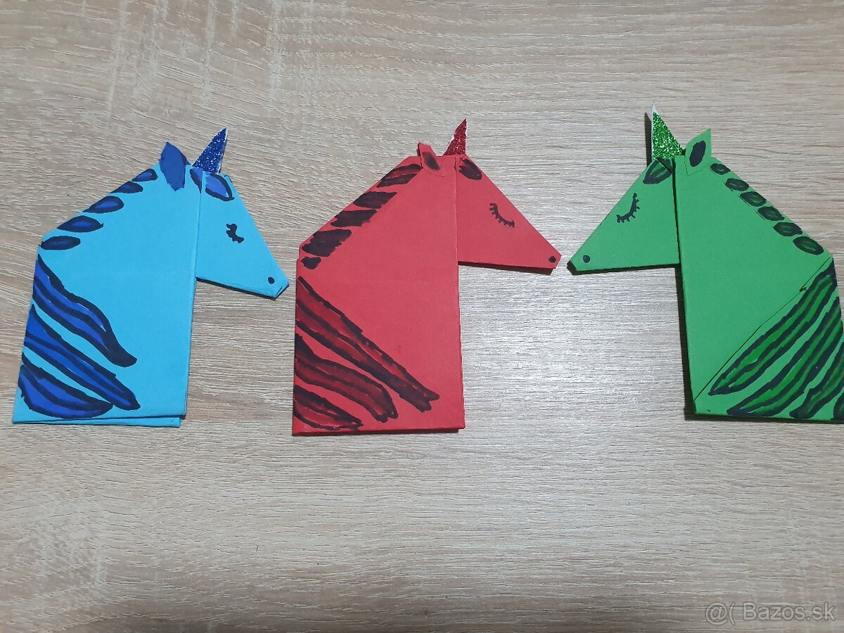 Dcera vyraba jednorozcove zalozky do knihy. Je mozne ich vyrobit v roznych farbach. Kazdy jednorozec je obojstranny. Zalozka sa vklada do dolneho rohu knihy (vid.foto), tym ze je obojstranna je mozne ju dat aj vpravo aj vlavo. Kazdy jednorozec ma trblietavy roh. Cena 1,50€/ks + poštovné.