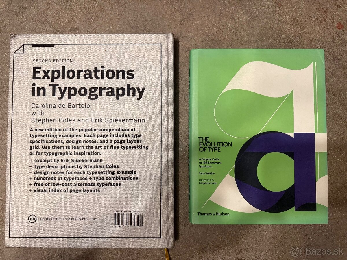 - Explorations in Typography, 40eur. Velkoformatova kniha, kvalitny papier, velmi dobry stav. https://www.goodreads.com/book/show/36293380-explorations-in-typography